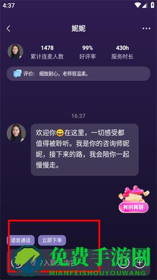 4、在聊天页面,可通过输入框发送内容,向妮妮进行咨询。