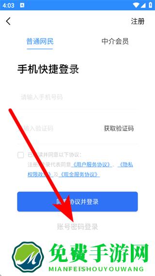 3、在注册页面,点击账号密码登录,进入密码登录页面。