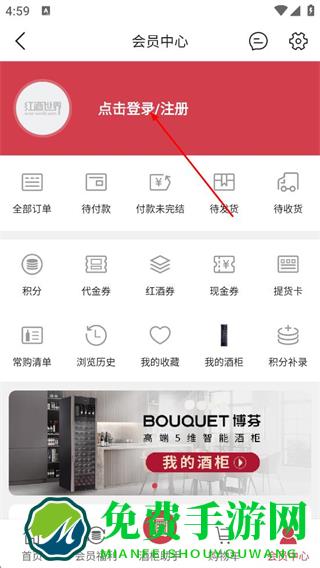 2、在会员中心页面,点击点击登录/注册,进入登录选择界面。