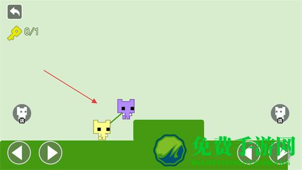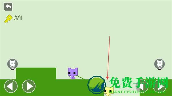 2、当遇到高低差地形时,控制其中一个角色移动,带动另一个角色越过障碍,如让黄色角色先下台阶,紫色角色随之移动。