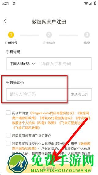 2、在敦煌网商户注册页面,输入手机号码,点击发送验证码。