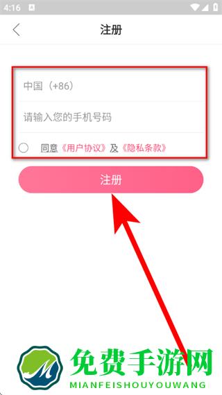 3、在注册页面,选择地区、输入手机号码,勾选后,点击注册。