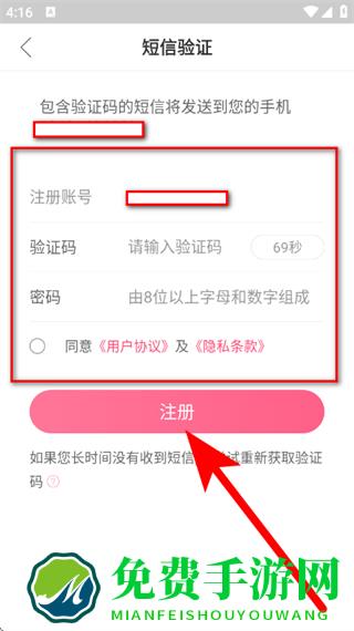 4、在短信验证页面,填写收到的验证码,设置密码,点击注册,完成账号注册。