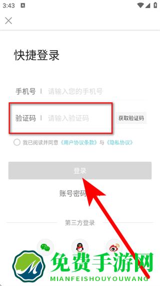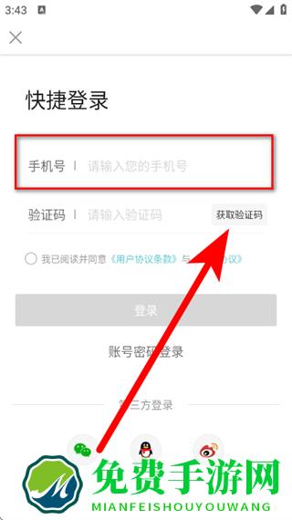 3、在快捷登录页面,输入手机号,点击获取验证码。
