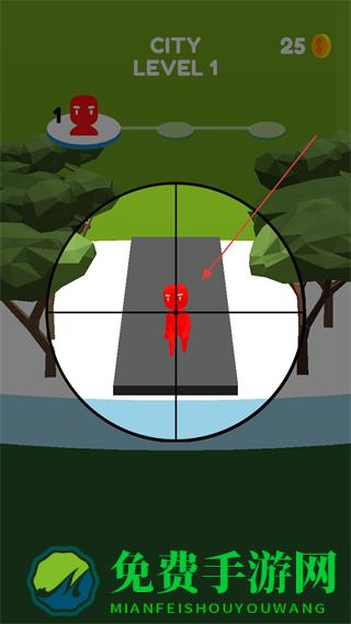 1、在CITYLEVEL1关卡,用狙击镜瞄准红色目标,准备射击。