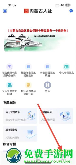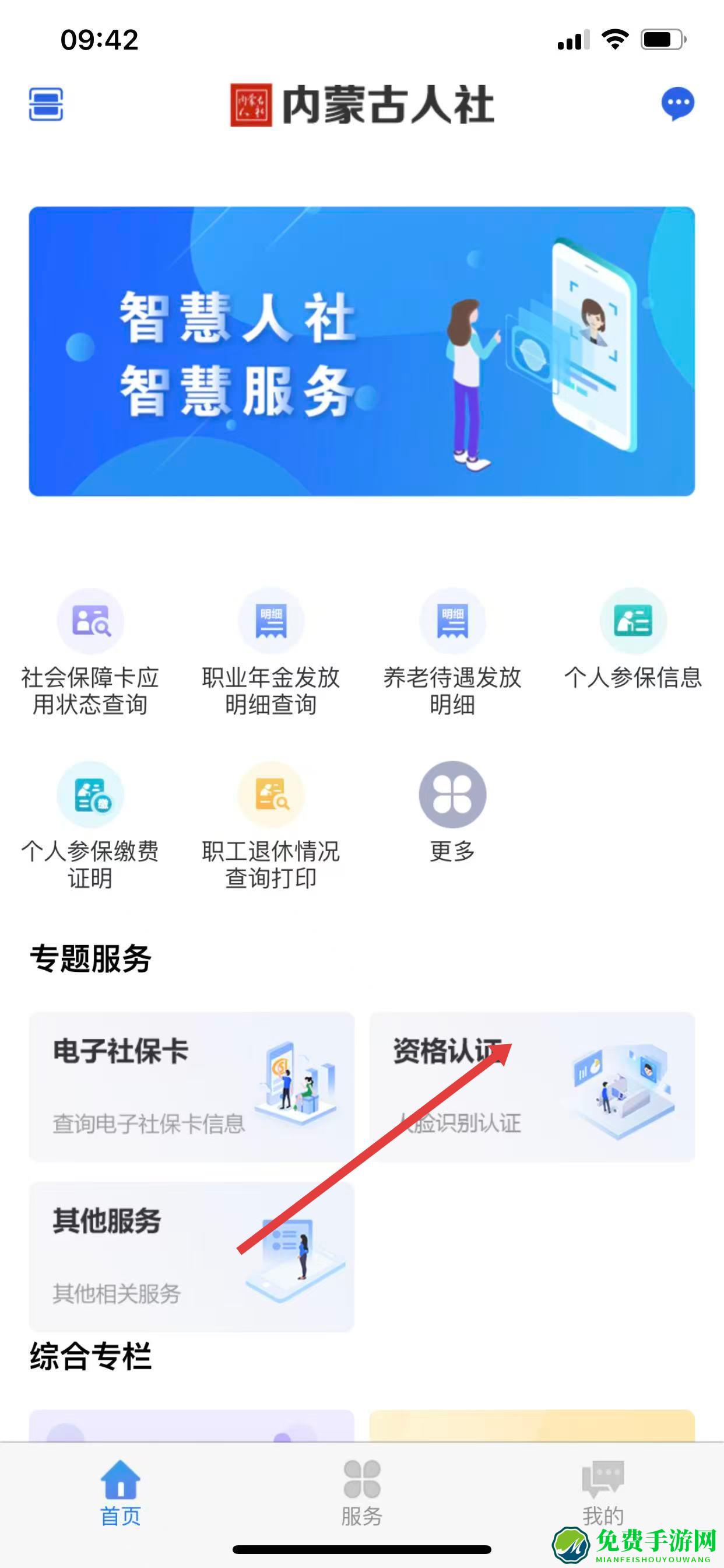 1、打开内蒙古人社app,点击专题服务中的资格认证选项。
