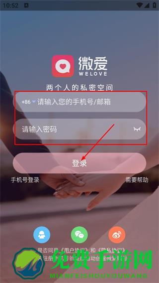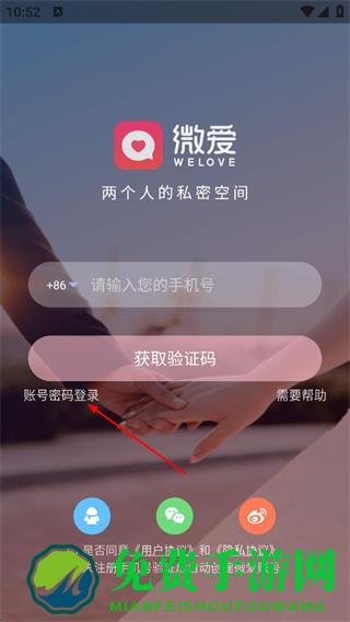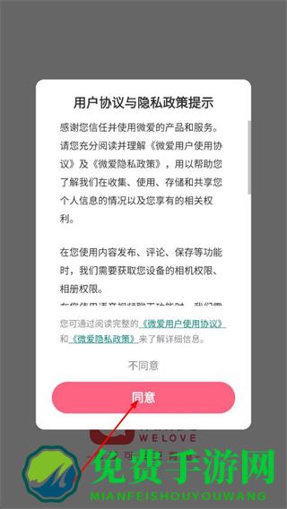 1、在微爱的用户协议与隐私政策提示弹窗中,点击同意,进入登录页面。