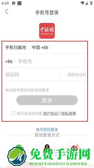 3、在手机号登录页面,填写信息并勾选协议后,点击登录完成账号登录。