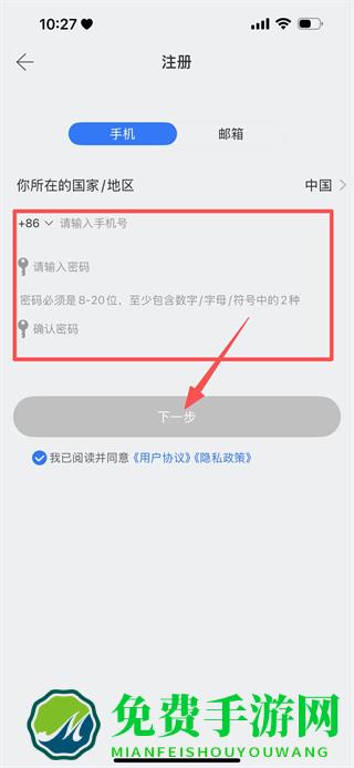 3、在注册页面,填写手机号、密码与确认密码,点击下一步,完成注册流程。