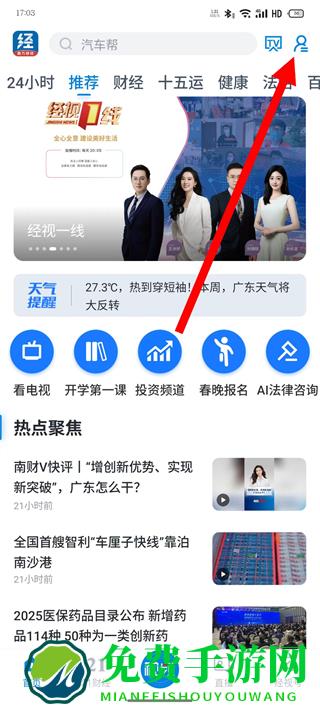 1、打开广东经视频,点击右上角的个人图标,进入个人相关页面。