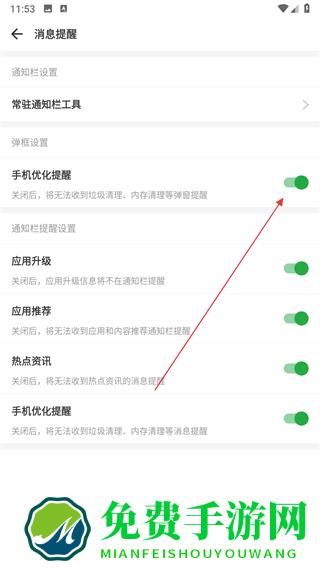 4、在消息提醒页面找到手机优化提醒对应的开关,点击开关将其调整为开启。