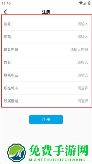 2、在注册界面依次填写账号密码姓名等信息,选择所在城市和所属区域后点击注册。