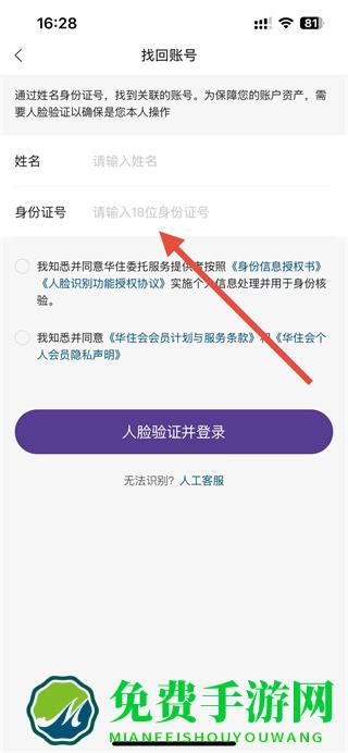 4、在找回账号页面,输入个人信息,勾选相关协议后,点击人脸验证并登录完成账号找回,后续可重置密码。
