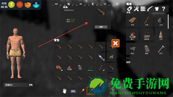 2、打开背包界面,查看已收集的资源如木头、工具,管理物资库存。