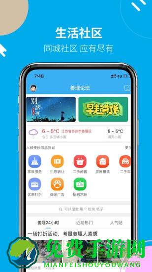 姜堰人网app是一款同城论坛软件,主要针对姜堰用户打造,集合相亲、照片、房产、汽车、娱乐、购物、丽人等信息为一体,在这里你可以快速获取城市动态,线上交流便捷,欢迎来免费手游网下载!