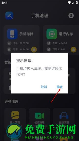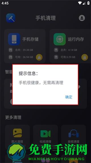 4、系统检测后弹出手机很健康无需再清理的提示,点击确定即可完成操作。
