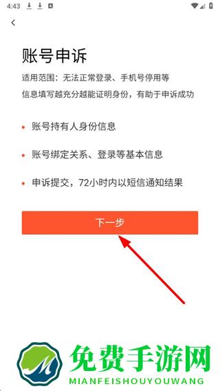 3、在账号申诉页面,点击下一步按钮,进入账号确认的信息界面。