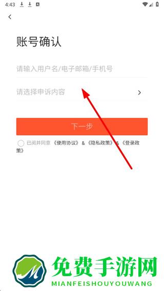4、在账号确认页面,输入账号信息、选择申诉内容,勾选协议后点击下一步,按提示完成申诉流程以解封账号。