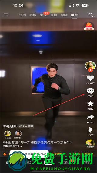 1、打开抖音的应用APP,进入时点击视频右侧评论的图标。