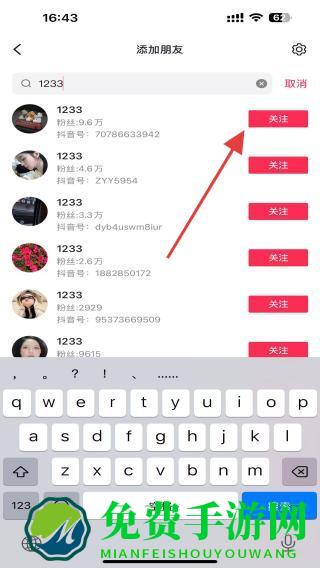 3、搜索结果中,找到目标账号后,点击右侧的关注的按钮,即可发送好友申请。