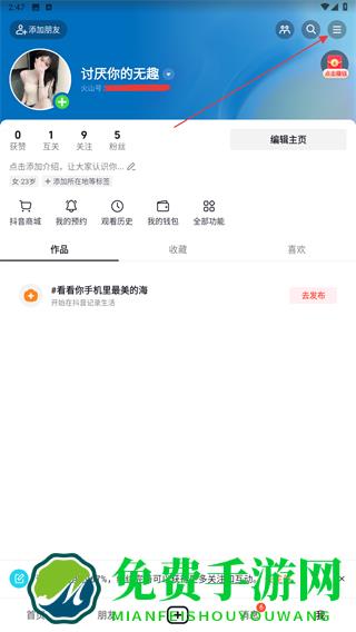 2、进入个人主页内,点击右上角三个横线的功能图标。