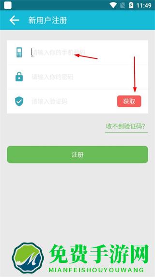 2、进入新用户注册页,先输入手机号码,点击获取获取验证码。