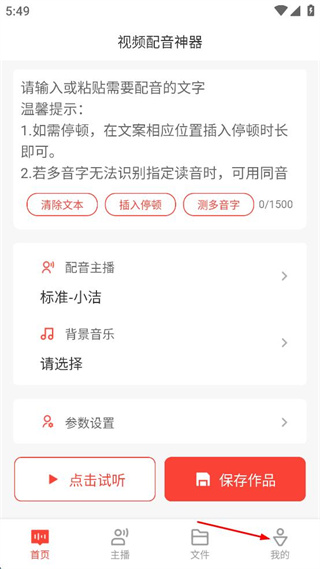 2、进入主界面后查看配音相关功能选项,点击底部我的选项进入个人中心页面。