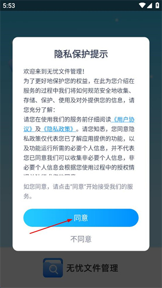 1、打开无忧文件管理,阅读隐私保护提示内容,点击页面中的同意按钮进入软件。