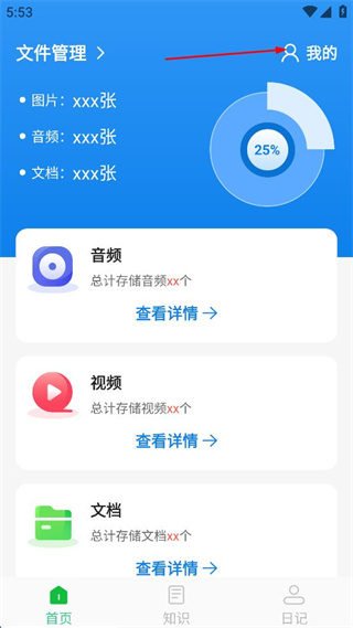 2、进入文件管理首页,找到页面右上角的我的选项,点击该选项进入对应的页面。