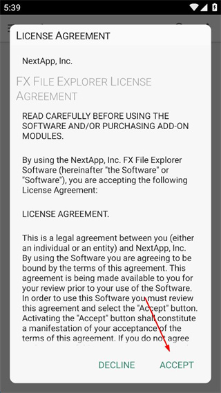 1、打开FXFileExplorer,阅读页面显示的许可协议,点击页面下方的ACCEPT按钮。