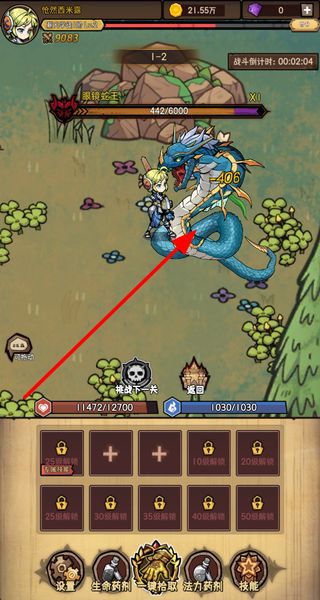 2、进入战斗关卡后,角色会自动攻击敌人,战斗中关注生命值和法力值,战斗结束后可选择挑战下一关或返回。