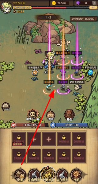 3、战斗胜利后会掉落道具和装备,点击一键拾取就能获取这些物品,收集的物品可用于强化角色。