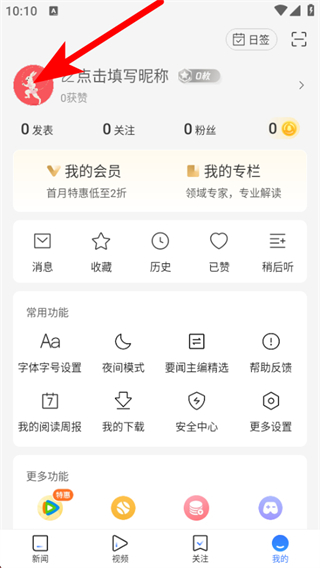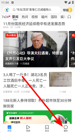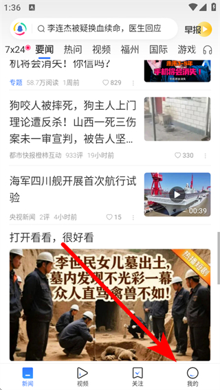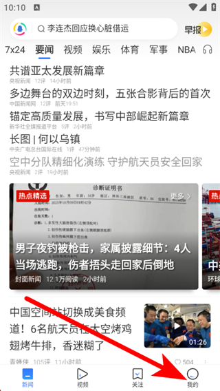 1、打开腾讯新闻,点击底部我的按钮,进入个人中心页面。