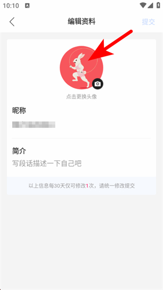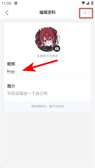 4、在编辑资料页找到昵称输入框,输入新的昵称后,点击右上角提交。