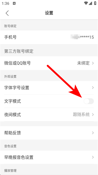 3、进入页面找到文字模式选项,将开关打开完成设置。
