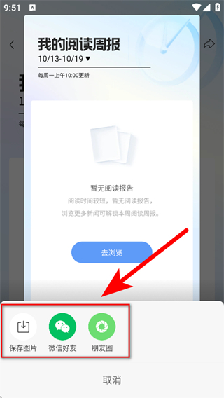 4、在分享选项中,选择保存图片等方式,完成阅读周报的分享操作。
