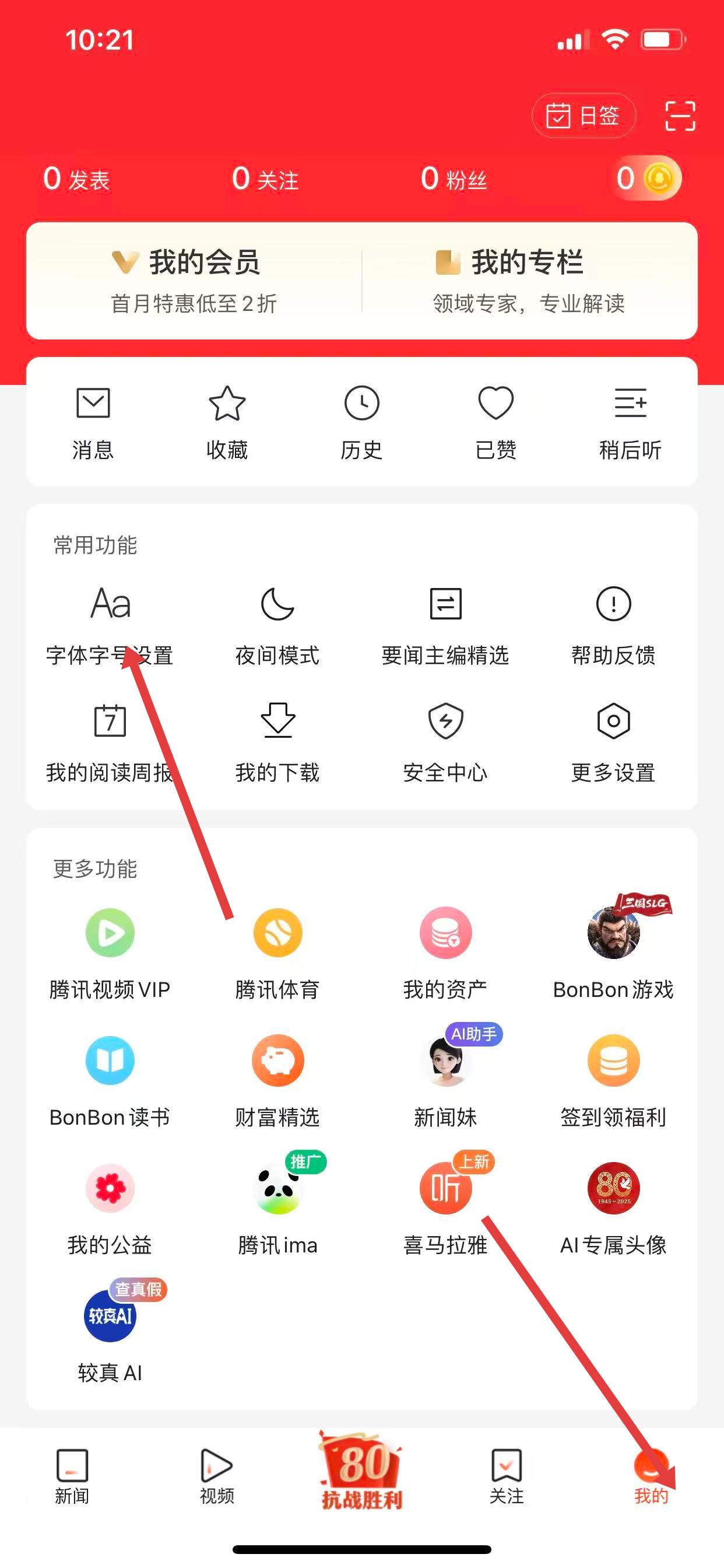 1、打开腾讯新闻APP,进入我的,在常用功能里点击字体字号设置。