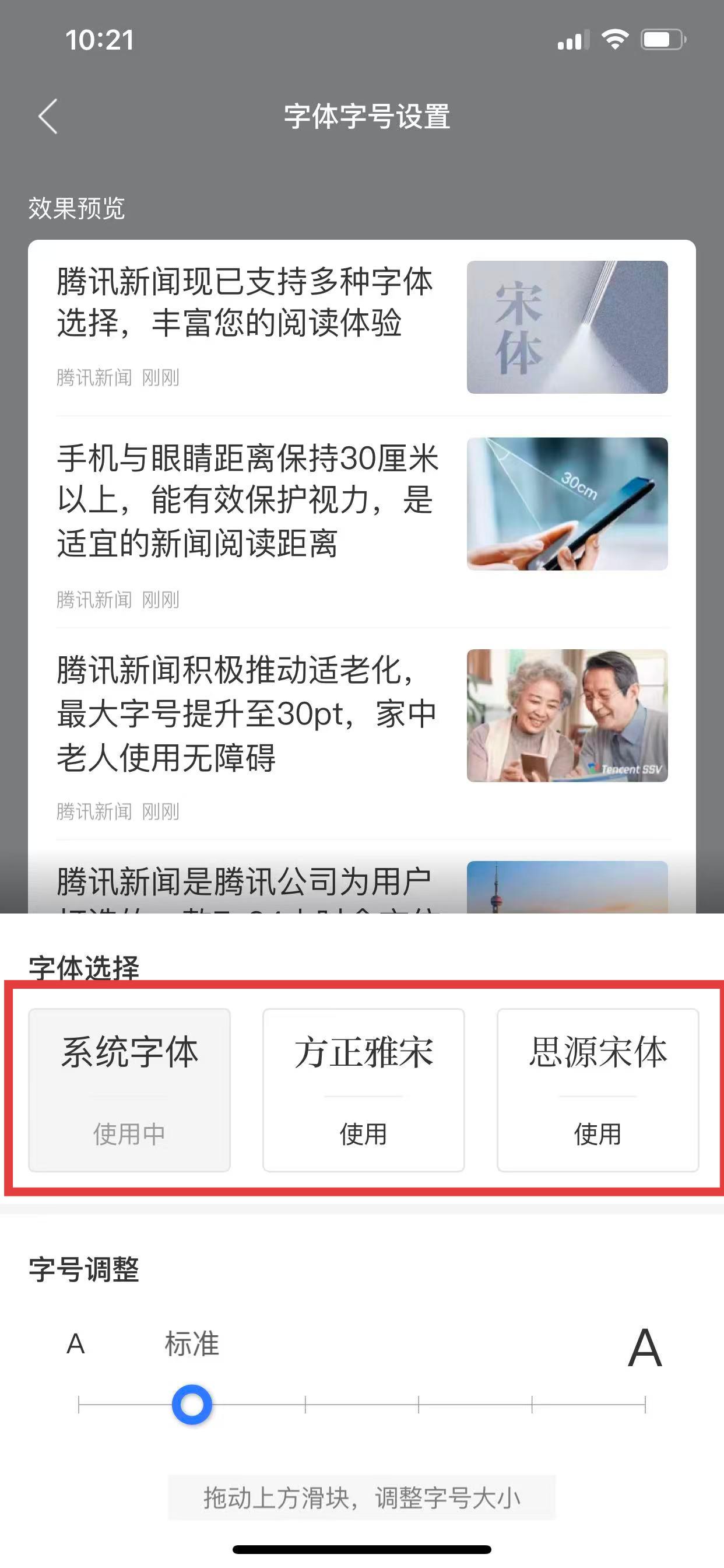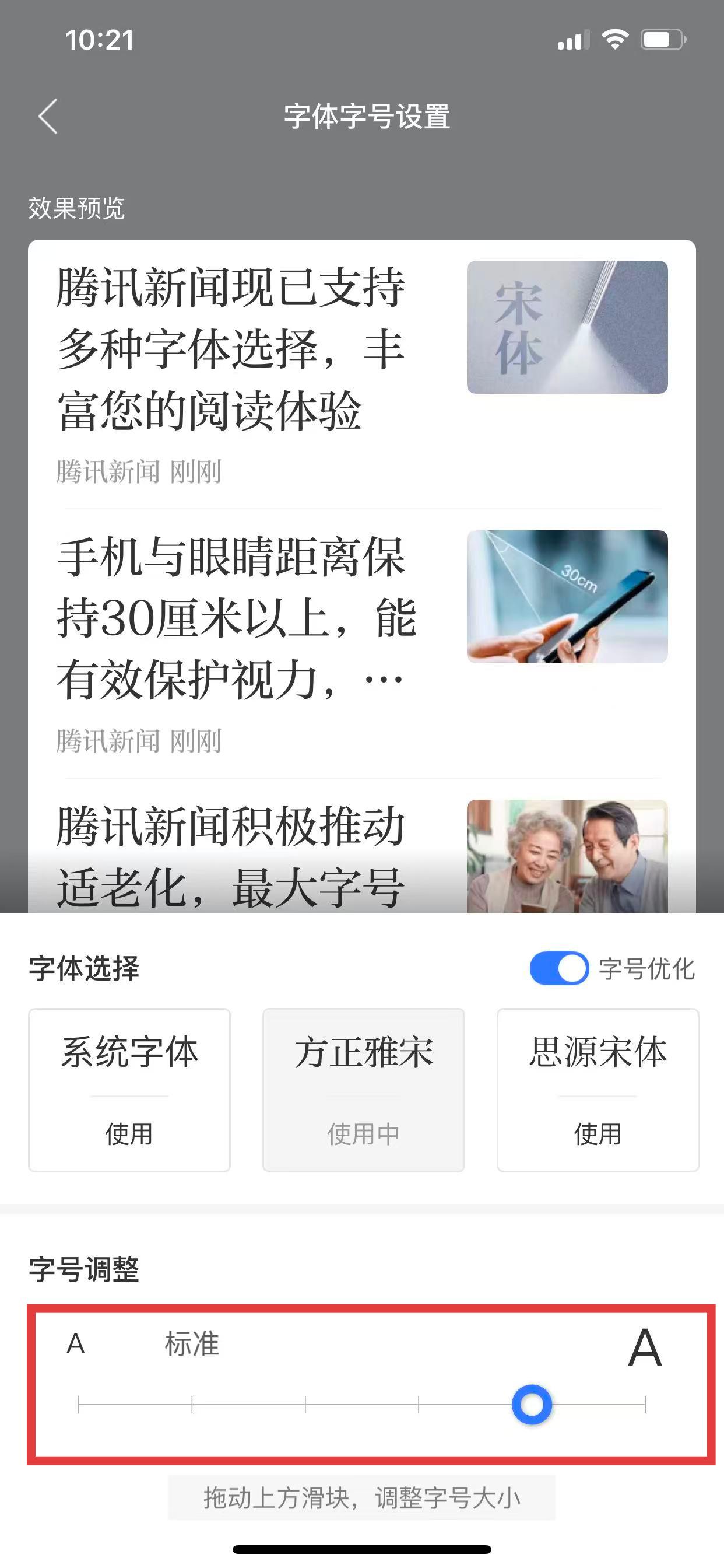 3、在字号调整区域,拖动滑块左右移动,即可调整字体大小,左侧A小代表缩小字号,右侧A大代表放大字号。