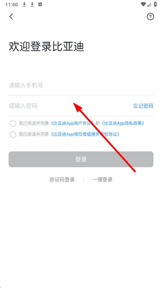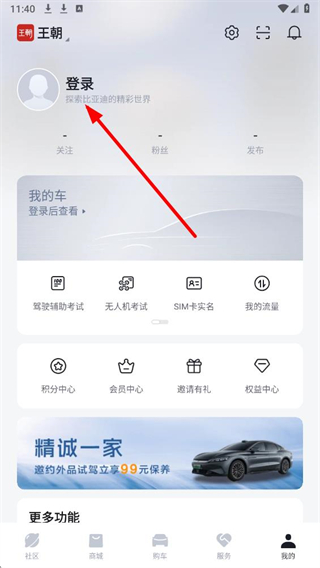 2、在个人页面中,点击登录按钮,跳转至比亚迪app的登录操作界面。