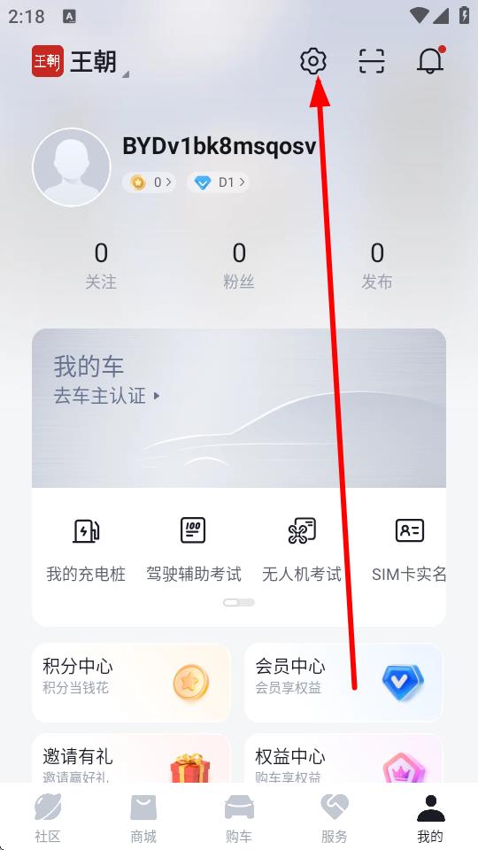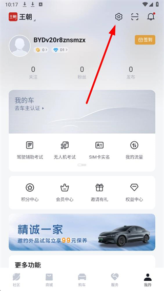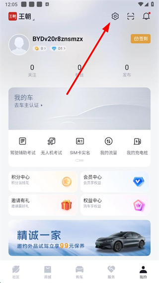 1、打开比亚迪app,在我的页面点击右上角设置图标,进入设置界面。