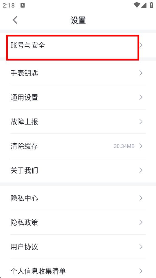 3、进入设置页面后,点击账号与安全选项。