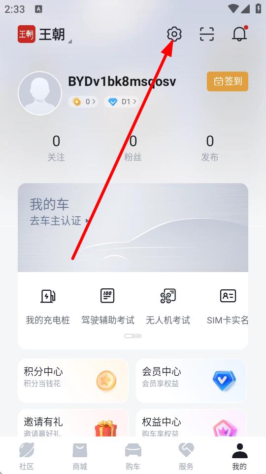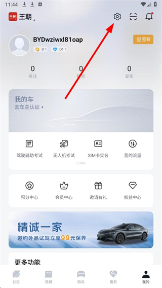 1、在比亚迪app个人页面,点击右上角设置图标,进入设置操作界面。