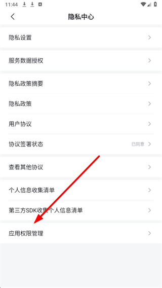 3、在隐私中心页面,点击应用权限管理选项,进入对应权限的管理界面。