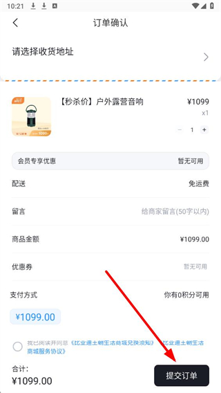 4、在订单确认页面,选择收货地址,勾选协议后点击提交订单,完成支付即可完成商品购买。