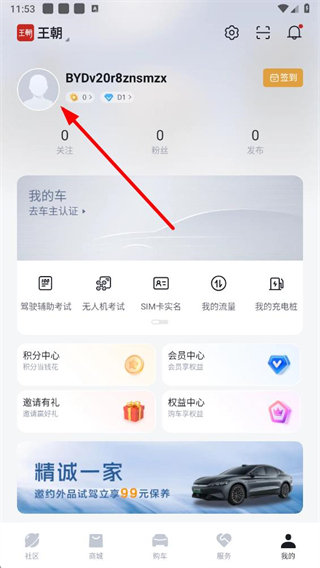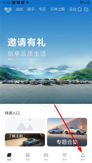 1、打开比亚迪app,在首页点击右下角我的选项,进入个人页面。