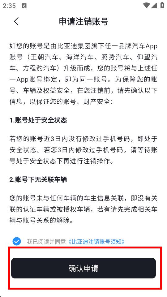 4、在申请注销账号页面,确认账号处于安全状态且账号下无关联车辆,勾选同意,点击确认申请,按提示完成注销。