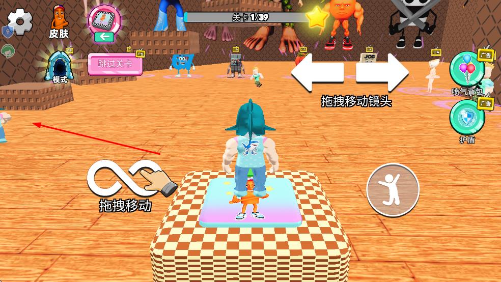 2、拖拽界面中的移动按钮,控制角色在场景内移动,同时可拖拽调整镜头视角。