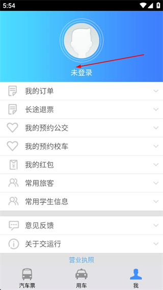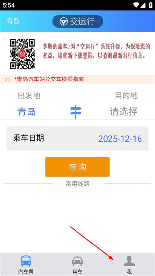 1、打开交运行应用,看到首页的车票查询界面,点击底部导航栏的我选项,进入个人页面。
