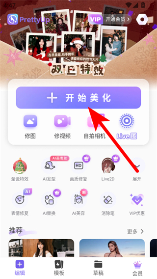 1、打开PrettyUpapp,点击页面中的+开始美化按钮,进入素材选择环节。