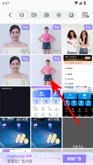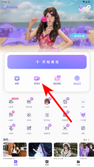 1、打开PrettyUp应用,点击修视频,进入视频选择界面。